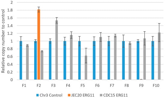 ERG11 is located on Chromosome 1, which is typically present in a single copy in the genome in haploid strains of C. neoformans and C. deneoformans. It encodes for cytochrome P450 lanosterol-14-α-demethylase, which is the target for fluconazole [14]. However, ERG11 has been previously found to be often amplified under fluconazole stress [15]. Here we investigated the copy number of the JEC20 and CDC15 alleles at the ERG11 locus in the mutation accumulation lines under fluconazole stress after the final (i.e., 40th) transfers. Figure 5 shows the relative copy number of the ERG11 gene from both the JEC20 and CDC15 parents. The copy numbers were all normalized to the reference marker CNAG_02959 on Chr3. Marker CNAG_02959 was chosen as our qPCR reference here based on the results by Sionov et al. [12]. In that study, Chromosome 3 (and marker CNAG_02959 on this chromosome) was stable under various fluconazole selection pressure. Specifically, CNAG_02959 maintained its single-copy status in all the strains derived from the haploid strain H99 under various fluconazole concentrations. In contrast, other chromosomes such as Chromosomes 1, 4, 10, and 14 showed differences in copy numbers among the H99 derivatives exhibiting various levels of fluconazole heteroresistance. Of the ten F-series lines in our study, seven had two copies of the CDC15 (A) allele of ERG11 gene and one (line F3) had three copies of the CDC15 ERG11 allele. The only F-series line with only one copy of the CDC15 ERG11 gene was line F5. Interestingly, in line F2 where heterozygosity for Chromosome 1 was maintained for both markers, there seemed to be about four copies of the JEC20 ERG11 allele and close to two copies of the CDC15 ERG11 allele (Figure 5). Overall, the results suggested that in most cases, fluconazole stress was associated with loss of the JEC20 (D) allele and amplification of the CDC15 (A) allele. However, amplification of both the JEC20 and/or the CDC15 allele in line F2 might also contribute to its high fluconazole MIC.