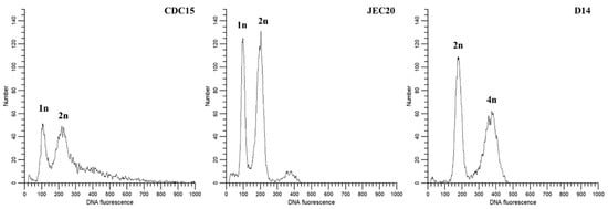 Four strains were used in this study: JEC20 (C. deneoformans, MATa, D), CDC15 (C. neoformans, MATα, A), JK18 (C. neoformans × C. deneoformans), and D14. JK18 is a mating product between strains JEC20 and CDC15 and has shown to be heterozygous at most of the Polymerase Chain Reaction-Restriction Length Polymorphism (PCR-RFLP) markers examined in previous studies [11,21]. JK18 has a fluconazole MIC of 64 µg/mL. Strain D14 was a diploid fusion product of C. deneoformans [22]. Strains JEC20, CDC15, and D14 were used as references for identifying the ploidy of experimentally evolved cultures.