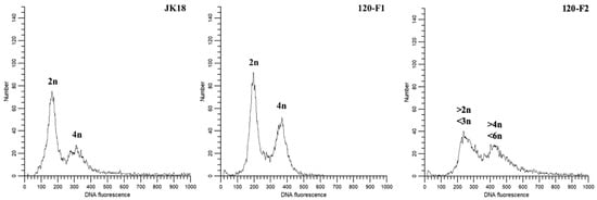 All the Day120 cultures of the 20 mutation accumulation lines were tested for genome content by fluorescence-activated cell sorting (FACS). The results demonstrated that 19 of the 20 lines maintained their ploidy levels at around 2N, similar to the original clone of JK18. The exception was line F2, which showed a ploidy level greater than 2N and close to 3N (Figure 6). Figure 6 shows the FACS profiles of three reference strains as well as the founder strain JK18 and two representative Day 120 cultures from lines F1 and F2. However, due to the coarse nature of FACS, minor gains or losses of genomic DNA contents including the gain and loss of entire chromosomes could not be detected or confirmed by FACS profile alone.