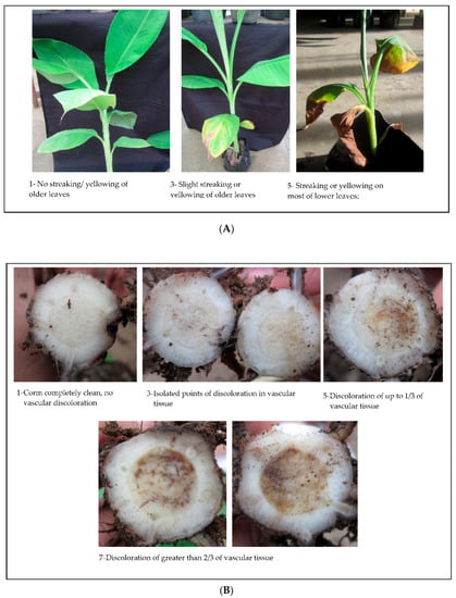 (A). Sample representatives of plants with leaf symptoms. Majority of the isolates tested had very mild leaf symptoms in test plants, none of which exhibited symptoms with rating scale of 7 and 9. (B). Sample representatives of vascular discoloration with different scale, except rating 9 which wasn’t observed in all isolates tested.