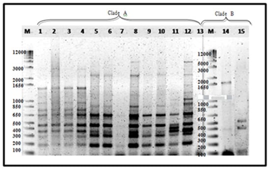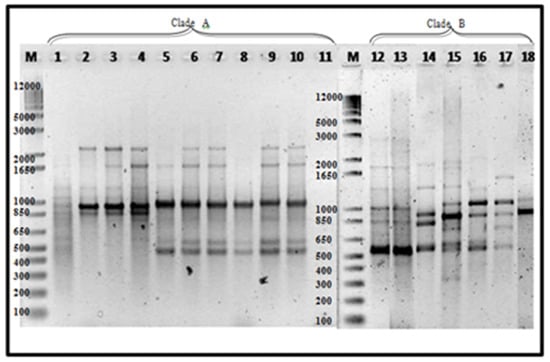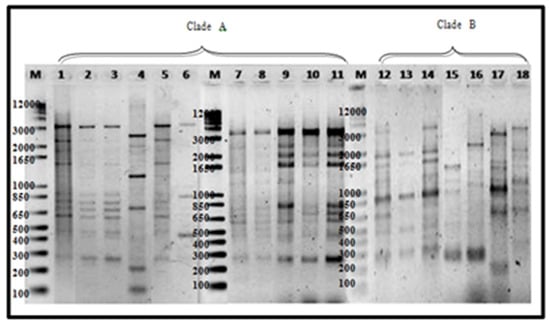 The use of M13 primer is considered as RAPD-PCR, since no preliminary information on the target sequence is required. Foc being a haploid asexual pathogen can be effectively analyzed using arbitrary primer techniques such as RAPD and DNA amplification fingerprinting (DAF) [42]. As enumerated by Bentley [57], additional advantages of using RAPD-PCR to study genetic variation include the following: (1) it does not involve the use of cloning, sequencing or radioactively labelled probes, (2) primers can be designed for various levels of differentiation, (3) it is applicable to large numbers of isolates and (4) it analyses variation at more than one locus. Using M13 primer, eighteen 18 banding patterns were observed ranging from 2800 bp to 100 bp (Figure 5).