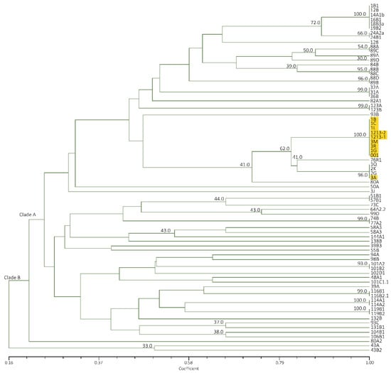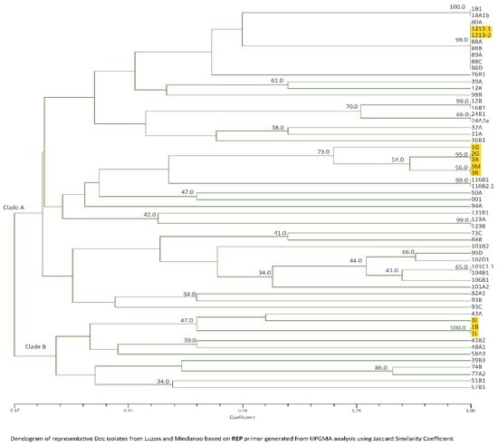 Mindanao and Luzon isolates generated a similarity value of 16–100% with a total of 22 banding patterns. Two clades were also formed with all Mindanao isolates grouped in clade A having high similarity value at 40–100%, except isolate 3J (Figure 4). The major banding pattern at 650, 450, 300 and 200 bp with an insert at 350 bp is a characteristic feature of Mindanao isolates. Isolates tested positive to Race 4 using primer designed by Lin et al. [31] were categorized in both clades where isolates 24A2a, 31A, 32A, 94A, 101A2, 101B2, 102D1, 104B1,106B1 and 48A1 were under clade A, while only isolate43B2 in clade B. Using ERIC−PCR analyses, Leong et al. [54] likewise categorized isolates from Malaysia and Indonesia into two distinct clades. Furthermore, the suitability of ERIC−PCR was emphasized due to higher variation as compared to PCR−RFLP of ITS+ 5.8S regions [18]. The whole genome is analyzed with ERIC−PCR, as compared to RFLP, which involves specific regions only, giving more information in analyzing closely related species [20,55].