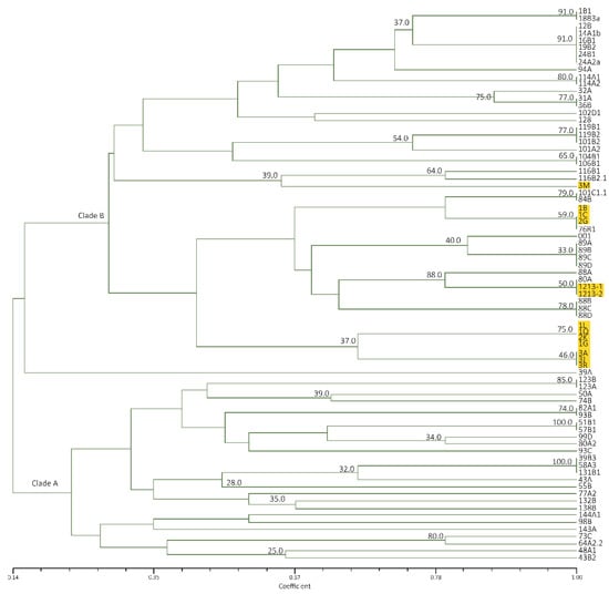 UPGMA cluster analysis on Luzon isolates revealed a similarity of 18–100% forming two clades. With Mindanao isolates, total of 22 banding patterns of the same range as the latter were observed forming two clades as well with similarity value of 14–100% (Figure 6). Consistent in clade A is the presence of 900 bp major band, while 1000 and 850 bp bands are consistent with majority of isolates belonging to clade B. All Mindanao isolates were grouped together in clade A, consistent with ERIC−PCR analyses where a distinct feature includes the presence of a 450 bp very distinct band and 500 bp faint band. Considering ten isolates that were positive to Race 4 using Foc/Foc2 primers, clade A includes 24A2a, 31A, 32A, 94A, 101A2, 101B2, 102D1 and 104B1, while clade B include isolates 43B2 and 48A1.
