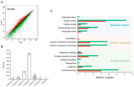 Summary of the transcriptomic analyses of wild type (WT) and Δrax1 strains. (A) Linear fitted model showing the correlation of overall gene expression between WT and Δrax1 strains. The correlation coefficient (R = 0.95) is indicated. (B) Histograms showing general transcriptomic results where the white bars fall in the −1 < log2FC < 1 fragment count range with low differential expression values. (C) Functional categories of DEGs. Genes associated with increased mRNA levels in the Δrax1 strain are represented with red bars and genes associated with decreased mRNA levels in the mutant strain are represented with green bars.