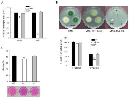 In RNA-seq analysis, we found that the transcript encoding the metacaspase CasB was significantly down-regulated (Log2FC = −2.90) in the Δrax1 mutant compared to WT (Table S3). To test whether Rax1 affects metacaspases expression, qRT-PCR analysis for the casA and casB transcript was carried out. The deletion of rax1 led to reduced mRNA levels of metacaspase encoding genes (Figure 3A). To test sensitivity against endoplasmic reticulum (ER) homeostasis disrupting agents, radial growth and survival rates of three strains were determined in the presence of dithiothreitol (DTT), 2-deoxy-D-glucose (2-DG), and brefeldin A (BFA). The radial growth of the mutant was reduced by the treatment of DTT and 2-DG (Figure 3B). Markedly, the Δrax1 mutant exhibited significantly restricted vegetative growth on the medium containing 0.1% 2-DG as the sole carbon source (about 50% of WT and C′ strains) (Figure 3B). Against another ER stressor BFA, as shown in Figure 3C, while viability of WT and C′ strains was about 47%, but that of Δrax1 strain was 35% indicating that it is likely that Δrax1 might lead to reduced tolerance to BFA (Figure 3C).