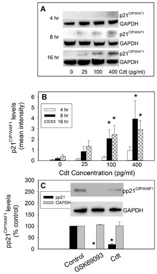 Cdt derived from A. actinomycetemcomitans, Haemophilus ducreyi, and Helicobacter hepaticus were shown to induce increases in p21CIP1/WAF1 within 24–48 h in several cell lines including fibroblasts, lymphocytes, enterocytes, and hepatocytes [16,34,35,36,37,38]. Likewise, we now demonstrate that A. actinomyetemcomitans Cdt induces increases in p21CIP1/WAF1 levels in Jurkat cells in a time- and dose-dependent manner. Jurkat cells were treated with varying amounts of Cdt (0–400 pg/mL) for 4, 8, and 16 h and then analyzed by Western blot to assess total p21CIP1/WAF1 levels (Figure 1A,B). Analysis indicates that a small, but consistent, increase in p21CIP1/WAF1 was detected within 4 h in cells exposed to the highest concentration of Cdt (400 pg/mL). Following an 8-h exposure, significant increases of nine- and 18-fold were observed in cells exposed to 100 and 400 pg/mL Cdt, respectively. After a 16-h exposure, the relative levels of p21CIP1/WAF1 remained elevated; cells treated with 25, 100, and 400 pg/mL Cdt exhibited three-, six-, and seven-fold increases, respectively.