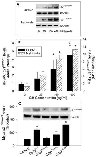 To verify that the effects of Cdt on p21CIP1/WAF1 levels were not unique to the Jurkat cell line, the cutaneous T-cell lymphoma line, MyLa, was also assessed for altered p21CIP1/WAF1 levels when exposed to the same doses of Cdt. As shown in Figure 2A,B, MyLa cells treated with 0–400 pg/mL Cdt for 16 h exhibited significant increases in p21CIP1/WAF1levels: 4.5- (100 pg/mL Cdt) and 5.7-fold (400 pg/mL Cdt) over control levels. In addition to lymphoid cell lines, p21CIP1/WAF1 levels were assessed in primary human lymphocytes (HPBMCs). As shown in Figure 2A,B, exposure to 25 pg/mL Cdt resulted in a detectable but not statistically significant increase in p21CIP1/WAF1. Significant increases in p21CIP1/WAF1 levels were observed in the presence of 100 and 400 pg/mL Cdt leading to 361% ± 82% and 673% ± 185% over that observed in untreated control cells.