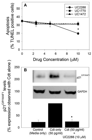 Effect of UC2288 on Cdt-induced apoptosis and on p21CIP1/WAF1 levels. JurkatWT cells were pre-incubated with 0–10 μM UC2288 or its inactive analogues UC1770 and UC1472 for 30 min. Cdt (50 pg/mL) was added to the cell cultures, and the cells were harvested 24 h later and analyzed for apoptosis using the TUNEL assay as described (panel (A)). Results are expressed as a percentage of apoptotic cells versus drug concentration; the mean ± SEM for four experiments is plotted. Panel (B) shows the effect of UC2288 on Cdt-induced p21CIP1/WAF1 levels at 16 h. A representative blot is shown along with results from four experiments. Western blots were analyzed by digital densitometry; the data are expressed as a percentage of the p21CIP1/WAF1 levels observed in cells treated with Cdt alone; * indicates statistical significance (p < 0.05) when compared to untreated cells.