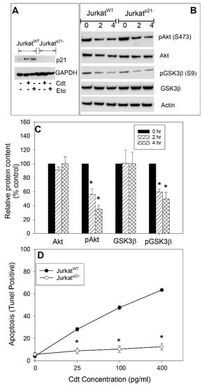Analysis of Jurkatp21− cells. CRISPR/Cas9 gene editing was employed to produce a Jurkatp21− cell line. Panel (A) shows the results of p21CIP1/WAF1 analysis by Western blot of both JurkatWT and Jurkatp21− cells at 16 h following exposure to either Cdt (50 pg/mL) or etoposide (Eto; 50 μM); GAPDH is shown as a gel loading control. Panels (B,C) show the effect of Cdt on PI-3K signaling targets. JurkatWT and Jurkatp21− cells were treated with medium alone (0) or with Cdt (50 pg/mL) for 2 or 4 h and then analyzed by Western blot for the expression of Akt, pAkt (S473), GSK3β, and pGSK3β (S9), as well as actin which served as a loading control. Representative blots are shown in panel (B), and the results of three experiments for Jurkatp21− cells are shown in panel (C). Data are plotted as the percentage of protein expressed in untreated control cells; the mean ± SEM is shown and * indicates statistical significance (p < 0.05) when compared to untreated cells. Panel (D) shows the effect of Cdt on apoptosis (TUNEL-positive) in JurkatWT and Jurkatp21− cells. The percentage of apoptotic cells was determined at 24 h and is plotted versus Cdt concentration; the mean ± SEM is shown for three experiments; * indicates statistical significance (p < 0.01) when compared to untreated cells.