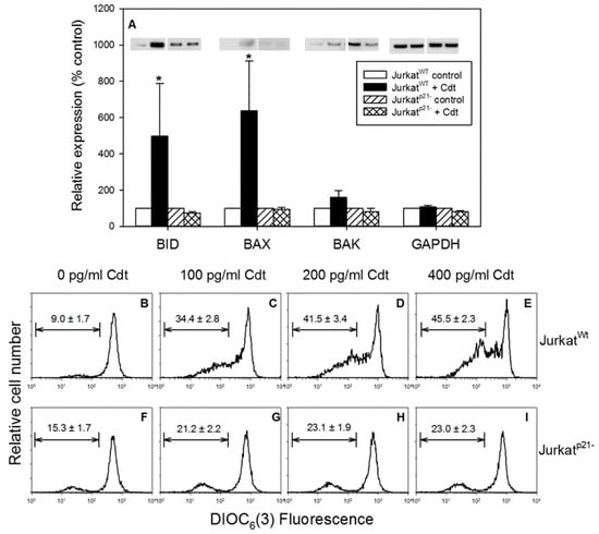 Effect of Cdt on the expression of pro-apoptotic Bcl-2 family members, as well as on the ΔΨm. Panel (A): JurkatWT and Jurkatp21− cells were incubated with medium or 50 pg/mL Cdt for 8 h. Cells were then analyzed by Western blot for Bid, Bax, Bak, and GAPDH (loading control). Representative blots are shown on top for Bid, Bax, Bak, and GAPDH for JurkatWT cells exposed to medium and Cdt-treated, as well as for Jurkatp21− cells exposed to medium and Cdt-treated. Western blots were analyzed by digital densitometry; results represent the levels of protein expressed as a percentage of that observed in respective control cells. The mean ± SEM for five experiments is shown; * indicates statistical significance (p < 0.05) when compared to untreated cells. Panels (B–I) show the effect of Cdt (0–400 pg/mL) on the ΔΨm in both JurkatWT (panels (B–E)) and Jurkatp21− cells (panels (F–I)). ΔΨm was determined using DIOC6(3), and the percentage of cells exhibiting a reduction the membrane potential was determined using the analytical gate indicated; the numbers represent the mean ± SEM of three experiments, each performed in duplicate.