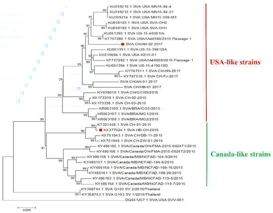 SVV-001 was the first SVA isolated from PER.C6 cells contaminated in 2002 []. SVV-001 is non-virulent to humans, and it was developed as an oncolytic agent to treat neuroendocrine tumors in humans [,,,]. SVV-001 can infect pigs but is not pathogenic, which indicates that it has no virulence to pigs []. In recent years, outbreaks of SVA infection have been reported worldwide, and many different virulent strains were isolated from clinical cases. In 2015, the first isolated virus of SVA infection was identified in China []. In a previous study, our research group reported an SVA strain isolated in the Hubei Province of China in 2016 []. To date, outbreaks of SVA infection are reported in many provinces in China. This situation means that SVA is widely found in pig farms in China [,,,]. Phylogenetic analysis indicated that SVA strains in pigs in China have five different types []. Hence, we further analyzed Chinese SVA strains belonging to USA-like SVA strains or Canada-like strains (Figure 1). Since 2017, isolated Chinese SVA strains were found to belong to USA-like strains, suggesting that USA-like SVA strains are predominant in China [].