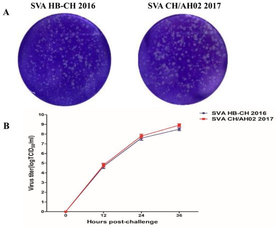 The confluent monolayers of SK-6 cells in a six-well cell culture plate were washed twice with PBS and then inoculated with the SVA HB-CH-2016 or SVA CH/AH-02/2017 strain at a multiplicity of infection (MOI) of 0.1. The cells were incubated at 37 °C for 1 h, and the inoculum was discarded and washed twice with PBS. Fresh DMEM, containing 2% FBS was then added. The cells were cultured in an incubator at 37 °C. The cell culture was harvested at 0, 12, 24, and 36 h. After three freeze-thaw cycles, the cultures were harvested by centrifugation and titrated by plaque assay or 50% tissue culture infective dose (TCID50) assay in SK-6 cells.
