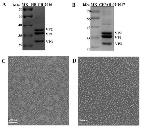 The SVA HB-CH-2016 and SVA CH/AH-02/2017 strains were cultured in SK6 cells. Approximately 500 mL of viral supernatant was harvested by centrifugation. The virions of SVA HB-CH-2016 or SVA CH/AH-02/2017 were purified successfully by high-speed centrifugation in sucrose gradient. SDS-PAGE was applied to analyze the purification of SVA. The SVA HB-CH-2016 and SVA CH/AH-02/2017 strains of capsid proteins (VP2, VP1, and VP3 proteins) were observed (Figure 3A,B). The purification of SVA was examined by electron microscopy (HITACHI, Tokyo, Japan). Results of electron microscopy showed that the virions of SVA HB-CH-2016 (Figure 3C) and SVA CH/AH-02/2017 (Figure 3D) were round, and the diameter of virions was approximately 30 nm.