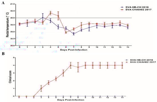 Rectal temperatures (A) and clinical scores (B) of the pigs infected with SVA HB-CH-2016 and SVA CH/AH-02/2017. All data were expressed as mean ± SEM.