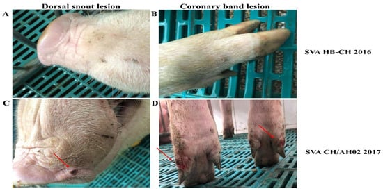 To compare the pathogenicity of SVA HB-CH-2016 and SVA CH/AH-02/2017, we divided 10 large white growing-finishing pigs of 90–100 kg into two groups: the SVA HB-CH-2016 and SVA CH/AH-02/2017 groups. In each group, the pigs were infected with the same dose of SVA. The rectal temperature and clinical signs of infection were periodically monitored daily throughout the experiment. No clinical signs were observed in the SVA HB-CH-2016-infected pigs, and the average rectal temperature of pigs did not exceed 40.0 °C during the experiments. After the experiment, all SVA HB-CH-2016-infected pigs remained healthy, and no signs of disease were found. The temperature of all pigs in the SVA CH/AH-02/2017 group slightly elevated to 40 °C at 4 and 5 dpi (Figure 4A). The clinical signs (lameness and vesicular lesions) were observed at 3 dpi, which continued until the end of the experiment. On the basis of the clinical scoring method for SVA, as described previously [], each pig was recorded daily after the experimental infection. As shown in Figure 4B, the clinical score of the SVA CH/AH-02/2017 group was calculated as 4. At 5 dpi, fluid-filled vesicles on the snout burst, and erosion on the upper lip was observed in pigs infected with SVA CH/AH-02/2017 (Figure 5). Thereafter, no new vesicular lesions were detected in any of the lips. At the same time, gross ulcerative lesions were detected on the feet. Throughout the experiment, the SVA HB-CH-2016 group did not present clinical signs and vesicular lesions. At 8 dpi, one pig from each group was euthanized. No apparent gross lesions at necropsy were found in either group, except for vesicular lesions in the SVA CH/AH-02/2017 group. These results indicated that the SVA CH/AH-02/2017 strain displayed higher pathogenicity to pigs than the SVA HB-CH-2016 strain.