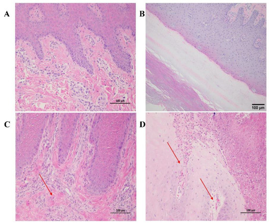 Pigs from each group underwent humane killing at 14 dpi, and pathological changes were described. No evidence of lesions at necropsy was found in the visceral (internal) organs. All the pigs in the SVA CH/AH-02/2017 group showed vesicular lesions on the feet or snout. Histopathological analyses were performed in the region of the lesion of the feet or snout. No histopathological lesions were observed in the lips and hooves of pigs infected with SVA HB-CH-2016 (Figure 6A,B). The pigs in the SVA CH/AH-02/2017 group showed moderate or severe necrosis, and the epithelial cells of necrotic foci exhibited swelling in the nasolabial skin and hoof epidermis. The histopathological lesions observed in the nasolabial skin and hoof epidermis were abundant neutrophil infiltrations, and a number of fragments of inflammatory cells existed in tissue (Figure 6C,D).