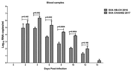 Comparison of viremia in the blood of pigs infected with the SVA HB-CH-2016 and SVA CH/AH-02/2017 strains. Viremia levels in the blood were determined by quantitative reverse transcription-polymerase chain reaction. The p value was calculated by the GraphPad Prism software. All data were expressed as mean ± SEM.