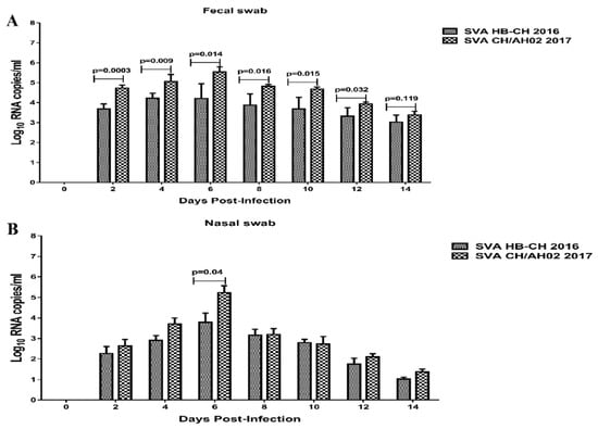 Viral shedding in pigs infected with the SVA HB-CH-2016 and SVA CH/AH-02/2017 strains. Viral shedding in the fecal swab (A) and nasal (B) samples of both the SVA HB-CH-2016 and SVA CH/AH-02/2017 groups was determined by RT-qPCR. The p value was calculated by GraphPad Prism software. All data were expressed as mean ± SEM.