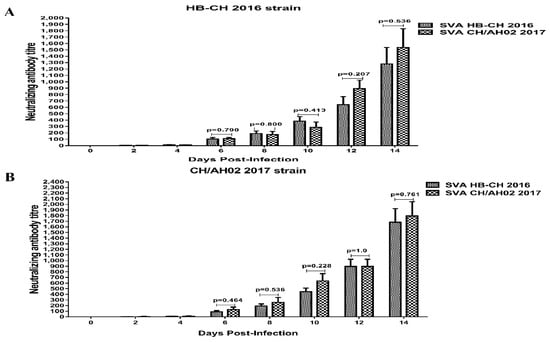 Comparison of the neutralizing antibody titers in serum samples from pigs infected with the SVA HB-CH-2016 and SVA CH/AH-02/2017 strains. The neutralizing antibody titers against the SVA HB-CH-2016 (A) and SVA CH/AH-02/2017 strains (B) were calculated and expressed as the highest dilution was inhibited completely. The p value was calculated by the GraphPad Prism software (GraphPad Software Inc., La Jolla, CA, USA). All data were expressed as mean ± SEM.