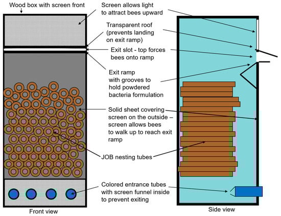 Front and side views of the dispenser nest developed for deploying the Japanese orchard bees (JOB) for vectoring biological control products.