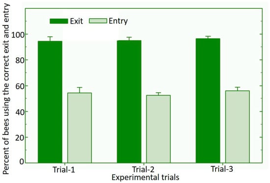 Utilization of the exit and entrance of the dispenser nest by the Japanese orchard bees. Error bars represent standard error.