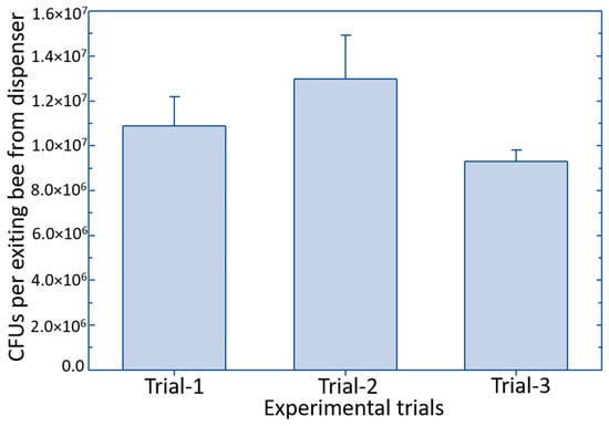 Amount of Bacillus subtilis (in terms of colony-forming units) carried by the Japanese orchard bees exiting the dispenser nest. Error bars represent standard error.