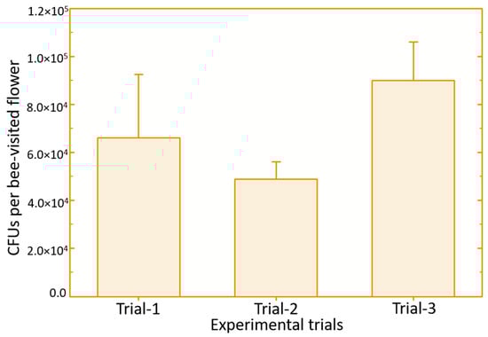 In this experiment, the amount of the biological control product collected by O. cornifrons bees exiting the dispenser and the proportion of the product that was deposited on individual flowers following legitimate visits was documented at the deployment rate of 250 bees/acre (25+ nest tubes) recommended for pollination. The same biological control product formulation used in Experiment 1 was used for this experiment. To determine the amount of the biocontrol product collected by an individual insect, bees exiting the dispensers were captured and placed in glass vials containing 2 mL of sterile 0.1 M potassium phosphate buffer (KPB) amended with 0.1 mL of Tween-20 surfactant per liter. The vials were shaken vigorously for 30 s, followed by incubation in a sonicating bath for another 30 s to dislodge the bacteria adhered to the body of the vectors. The wash buffer was subjected to serial dilution and plated either on nutrient yeast extract dextrose agar (NYDA) medium for B. subtilis []. All the plates were then incubated at 28 ˚C and the total number of colony-forming units (CFUs) were determined within three days of plating. Bees exiting dispensers in which no biocontrol product was placed were used as controls. Eight bees were assayed for the Serenade treatment in each of the three experimental runs. We also collected data on primary transmission. For this purpose, flowers (n = 8, from each experimental trial) were collected from potted crabapple trees (n = 6) immediately after being visited by the O. cornifrons bees carrying B. subtilis based biological control product and placed singly into vials (replicates) for assaying the quantity of B. subtilis by dilution plating as described above. The amount of Bacillus subtilis (in terms of CFUs) carried by the O. cornifrons bees exiting the dispenser nest was quantified in each trial.
