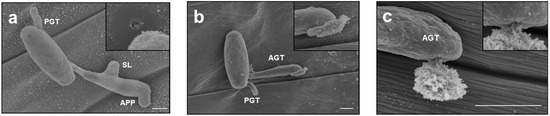 - Yamaoka, N.; Matsumoto, I.; Nishiguchi, M. The role of primary germ tubes (PGT) in the life cycle of Blumeria graminis: The stopping of PGT elongation is necessary for the triggering of appressorial germ tube (AGT) emergence. Physiol. Mol. Plant Pathol. 2006, 69, 153–159. [Google Scholar] [CrossRef]