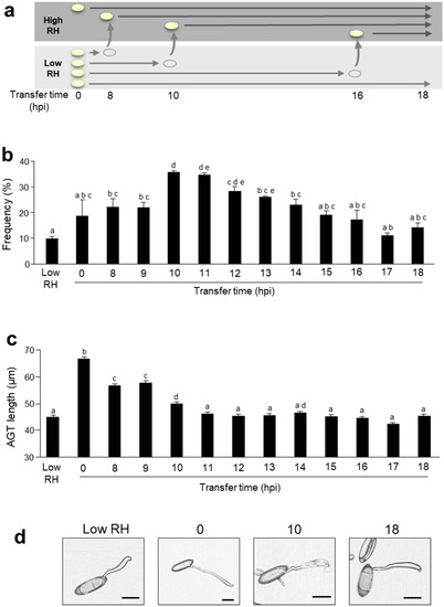 High humidity influences the formation of the appressorium. (a) The experimental scheme transferring conidia from low to high humidity condition. (b) Frequency of conidia with the leakage at the tip of the appressorial germ tube after transfer to the high humidity condition. After transfer, 200–300 conidia were counted at each time point and the frequencies of the leakage were calculated. Data represent means with standard deviation (n = 3). Different letters indicate significant differences (p < 0.05, Tukey–Kramer test). (c) Length of AGT after transfer to high humidity condition. Data represent means with standard deviation (n = 600–1000). Different letters indicate significant differences (p < 0.05, Tukey–Kramer test). (d) The representative conidia at the timing of each transfer were shown. hpi; hour post inoculation. Bar = 20 μm. These experiments were repeated three times with similar results.