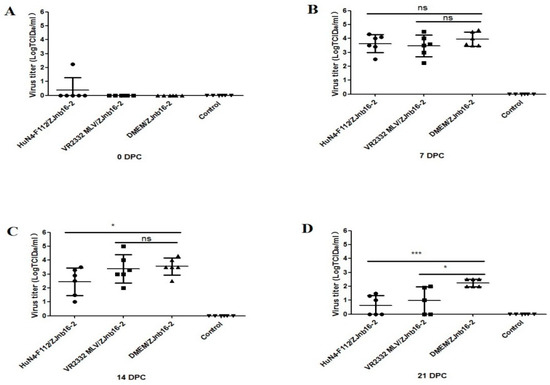 Virus titers in sera of the challenged piglets at 0, 7, 14, and 21 days post challenge (DPC) (A–D). Data were shown as means ± standard error (error bars). Asterisk indicates significant differences between vaccinated groups and Dulbecco’s Modified Eagle Media (DMEM) group (* p < 0.05; *** p < 0.001, ns means no significant differences).