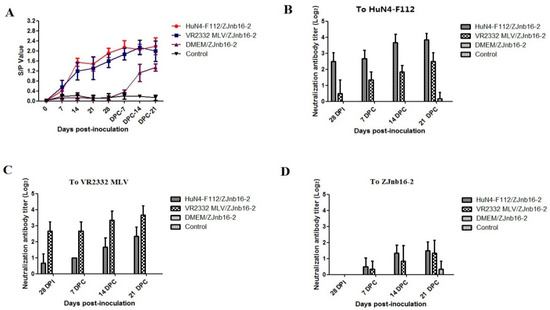 Detection of porcine reproductive and respiratory syndrome virus (PRRSV)-specific N protein antibody and neutralization antibody in each group. (A) N protein antibody level after vaccination and data are expressed as mean ± SD (error bars); Neutralization antibody titers against HuN4-F112 (B), VR2332 MLV (C), and ZJnb16-2 (D) of serum collected at 28 days post vaccination (DPV), 7 DPC, 14 DPC, and 21 DPC.