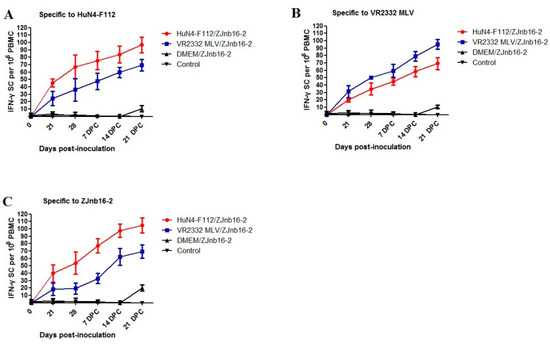 Kinetics of IFN-γsecreting cell responses against in vaccinated piglets. (A) The number of interferon (IFN)-γsecreting cells (SC) against strain HuN4-F112; (B) the number of interferon (IFN)-γSC against strain VR2332 MLV; (C) the number of interferon (IFN)-γSC against strain ZJnb16-2.