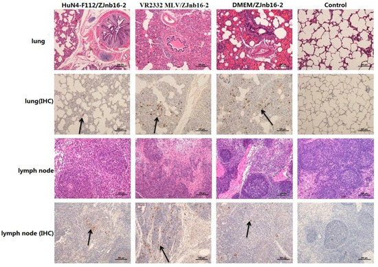 9D9, a mAb against N protein, was used for PRRSV antigen detection in lungs by immunohistochemistry (IHC). Results revealed that different intensities of positive staining in lung and lymph nodes were detected in all piglets except the control group (Figure 6). No positive signals were detected in the control group.