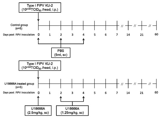The experimental schedule and information of cats are indicated in Figure 1 and Table 1, respectively. FIPV KU-2 (104.63 TCID50/0.5 mL) was inoculated intraperitoneally to specific-pathogen-free (SPF) cats. The control group (n = 5) was administered PBS, and the U18666A-treated group (n = 5) was administered U18666A subcutaneously at 2.5 mg/kg on day 0, and 1.25 mg/kg on days 2 and 4 after viral inoculation. Cats were examined daily for clinical signs and their body temperatures and weights were measured. Blood was collected weekly using a heparinized syringe after the virus inoculation, and complete and differential cell counts were measured. In addition, saliva was collected every 2 days, feces were collected daily, and they were preserved until analysis at −80 °C. FIP diagnoses were confirmed upon postmortem examination, revealing peritoneal and pleural effusions, and pyogranuloma in the major organs. The cats were euthanized when reaching the humane endpoint or 63 days after the challenge.