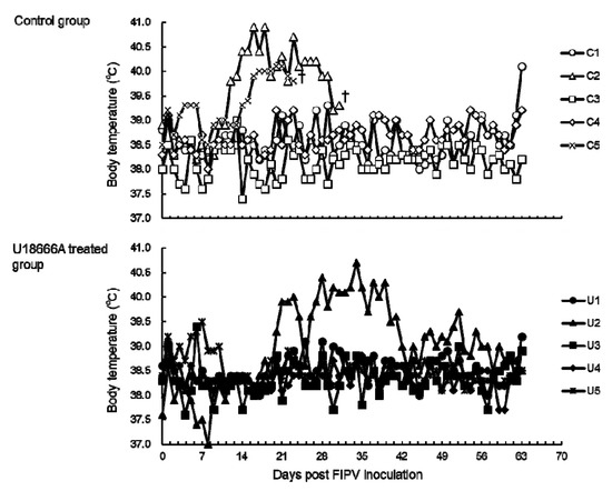 The body temperature was measured serially in cats challenged with FIPV. In the control group, cats No. C2 and C5 developed fever above 40 °C from 14 days post-infection (d.p.i.) and 17 d.p.i., respectively (Figure 2), which persisted until the humane endpoint. In addition, cat No. C1 developed fever above 40 °C on 63 d.p.i. In the U18666A-treated group, cat No. U2 developed fever above 40 °C from 23 d.p.i. The fever persisted until 39 d.p.i., but began to decline on 40 d.p.i. and did not recur until the end of the experiment. No other cats exhibited fever above 40 °C throughout the experiment.