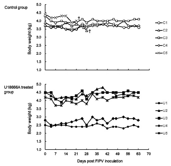 The changes in body weight of FIPV-infected cats. †: The cat was euthanized because its clinical condition reached the humane endpoint.