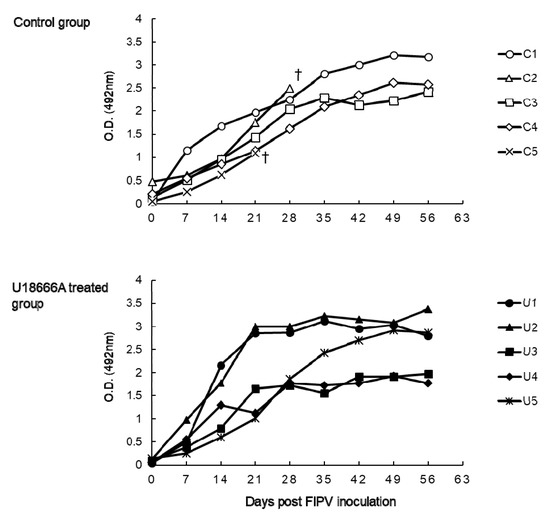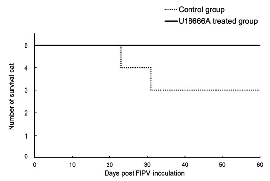 The animals used for the experiment were euthanized on the day on which the humane endpoint was judged to have been reached and plotted on the survival curve (Figure 7). In the control group, cat No. C2 was euthanized at 23 d.p.i. and cat No. C5 was at 31 d.p.i., respectively. In the U18666A-treated group, none of the cats developed FIP and they all survived. The incidences of FIP in the control were 2 of 5 cats. In U18666A-treated groups, the incidences of FIP were 0 or suspected 1 of 5 cats.