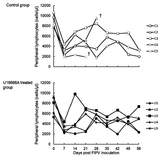 The changes on lymphocyte counts of FIPV-infected cats. †: The cat was euthanized because its clinical condition reached the humane endpoint.