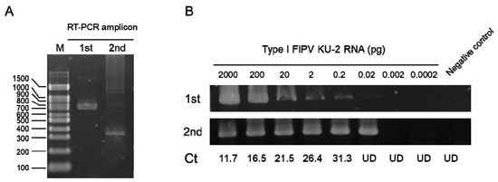 Sensitivity of nested-RT-PCR targeting the FIPV N gene. (A) RT-PCR amplicon. (B) Detection sensitivity of nested-RT-PCR for type I FIPV KU-2 RNA. Ct: Ct values by RT-qPCR targeting 3′-UTR. UD: Ct values were undefined.