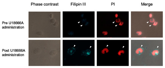 Localization of intracellular cholesterol in peripheral blood monocytes of SPF cat administered a single dose of U18666A. U18666A (2.5 mg/kg) was administered once to a SPF cat, and peripheral blood was collected before and 24 h after administration. Intracellular cholesterol of mononuclear cells, including peripheral blood monocytes, was stained by Filipin III, and the nucleus was stained by propidium iodide (PI). Arrowheads: peripheral blood monocytes.