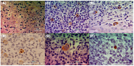 LMP1 and EBERs expression in tonsil and Hodgkin lymphoma (HL) Epstein-Barr virus (EBV)+ pediatrics patients. (A) EBERs-specific in situ hybridization with RNA probes revealed specific black–dark blue nuclear staining in Hodgkin Reed Sternberg (HRS) of pediatric HL; (B) LMP1 membranous and cytoplasmic positive staining in HRS at pediatric HL and (C) germinal centers (GC) positive lymphocytes in tonsil; LMP2A membranous and cytoplasmic positive staining in (D) pediatric HL and (E) at the GC in tonsil; (F) EBNA2 nuclear positive staining in tonsil lymphocyte.