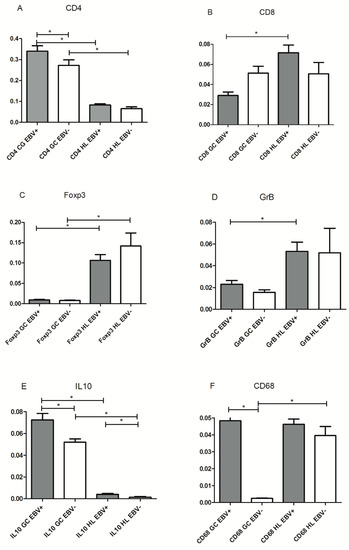 Comparison of immune cell markers (A) CD4; (B) CD8; (C) Foxp3; (D) GrB; (E) IL10; (F) CD68; analyzed in relation to EBV status, in tonsils and HL. Dark grey bars indicate EBV+ region and white bars indicate EBV+ region. The p-value is from the Wilcoxon test or Mann–Whitney test when appropriate (* p < 0.05).
