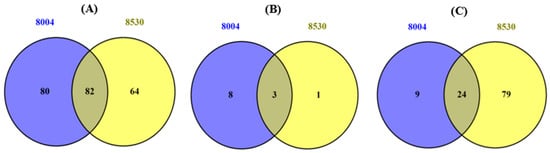Venn diagrams showing the overlapping/common (numbers in intersection) and distinct (numbers in the circle) candidate LPS-interacting PM-associated proteins when comparing the LPS chemotypes Xcc 8004 (blue) and Xcc 8530 (yellow) for the affinity strategies (A) polymyxin-B immobilized, (B) EndoTrap® HD Endotoxin removal, and (C) MagReSyn™ streptavidin magnetic polymeric microsphere affinity chromatography.