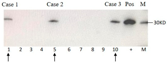 Western blot for 14-3-3. 15 μL of CSF sample each patient was subjected into 12% SDS-PAGE. Blots were incubated in 1:1,000 diluted 14-3-3 polyclonal antibodies (Santa Cruz, CA, USA) and further incubated in 1:5,000 diluted HRP-conjugated goat anti-Rabbit IgG (PerkinElmer, Germany). Immunoreactive bands were visualized by ECL method (PerkinElmer, Germany). M: molecular standards. (+): positive control of 10% goat brain homogenate. Arrows indicate the CSF samples of the individual V210I gCJD patients.