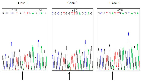 Graphic presentations of the sequences of PRNP from 3 Chinese V210I gCJD patients by direct sequencing. G/A heterozygote at codon 210 are detected, leading to an exchange from Val (V) to Ile (I). The arrows below the curves indicate the positions where both G and A are co-present.