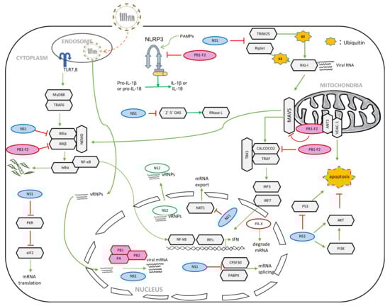 PB1-F2 is a small NSP, encoded by an alternate (+1) reading frame within the PB1 gene [100,101,102]. Unlike NS1 and NS2, the PB1-F2 protein is not in all IAV strains. It also has various lengths, amino acid sequences, and subcellular localizations in different strains, contributing to the strain-specific pathogenicity. PB1-F2 was first found to localize in the mitochondria and induce cell death [100]. Interestingly, the mitochondrial localization of PB1-F2 is strain-dependent [103]. Recent works further found that PB1-F2 blocks the RIG-I signaling pathway, modulates NLRP3 inflammasome activation, enhances viral polymerase activity, and promotes viral pathogenicity, as discussed below.