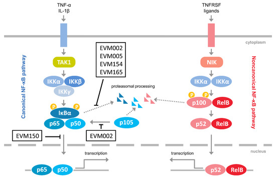 Considering the emerging role of the noncanonical NF-κB activation in antiviral innate immunity, as well as the fact that it regulates the canonical NF-κB signaling [11], we investigated how ectromelia virus (ECTV) influences the activation of the noncanonical NF-κB signaling components. ECTV is a pathogen of mice, belonging to the Poxviridae family and Orthopoxvirus genus. It is closely related to variola virus (VARV), a causative agent of smallpox and vaccinia virus (VACV), which was used as a vaccine against smallpox. Inhibition of NF-κB signaling by the members of the Poxviridae family has been studied extensively [22]. Figure 1 summarizes the modulation of NF-κB signaling by ECTV-encoded proteins [23,24,25,26]. Due to its similarities in genetic background and disease presentation with smallpox, mousepox (smallpox of mice) is recognized as an excellent model to study smallpox infection in humans, zoonotic monkeypox, as well as generalized viral infections. Importantly, a mousepox model is also used for testing medical countermeasures against VARV and other orthopoxviruses [27,28].