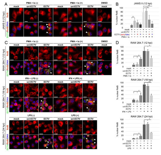 ECTV influences nuclear translocation of RelB in JAWS II and RAW 264.7 cells at 12–24 hpi. (A) Immunofluorescence microscopy images of subcellular localization of RelB in control and PMA + Io-treated mock-, uvi-ECTV, and ECTV-infected JAWS II cells at 12 hpi. RelB—red fluorescence, ECTV antigens—green fluorescence, DNA—blue fluorescence. DMSO—solvent control. White arrowheads indicate viral factories. Scale bar—20 μm. (B) Quantification of nuclear RelB-positive cells. Mock-, uvi-ECTV, and ECTV-infected JAWS II cells displaying round (early) and bloated (late) viral factories were analyzed. Graphs represent the percentage of cells displaying a greater intensity of fluorescence in the nucleus compared to control cells. Data were obtained from three independent experiments. A total of 50 cells/condition/experiment was counted (* p ≤ 0.05, ** p ≤ 0.01). (C) Immunofluorescence analysis of RelB subcellular localization in mock-, uvi-ECTV-, and ECTV-infected RAW 264.7 cells. Cells were either unstimulated or stimulated with PMA + Io, rmIFN-γ + Escherichia coli LPS O111:B4, or LPS O111:B4 and analyzed at 12, 18, and 24 hpi, respectively. (D) Quantification of nuclear translocation of RelB in mock-, uvi-ECTV, and ECTV-infected RAW 264.7 cells with bloated viral factories. Graphs represent the mean percentage of RelB-positive cells from three independent experiments. A total of 100 cells/condition/experiment was analyzed (* p ≤ 0.05, ** p ≤ 0.01).