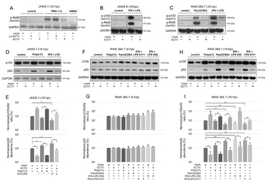 After 18 h of stimulation, there was a significant decrease in the ratio of p100/p52 in JAWS II cells induced by IFN-γ + LPS. ECTV infection, in turn, significantly increased the ratio of p100/p52 in poly(I:C)- or IFN-γ + LPS-treated cells (Figure 4D,E). Importantly, both ECTV alone and combined with all the ligands used for the stimulation significantly decreased the p52 level in JAWS II cells (Figure 4E). In RAW 264.7 macrophages, we did not observe any significant difference in the ratio of p100/p52 at 4 hpi (Figure 4F,G). At 18 hpi, a significant decrease in the ratio of p100/p52 was observed after treating the cells with Pam3CSK4 or IFN-γ + LPS. In addition, a significant increase in the ratio of p100/p52 was observed in ECTV-infected cells that were treated with poly(I:C), Pam3CSK4, or IFN-γ + LPS O111:B4 but not with IFN-γ + LPS O55:B5. However, ECTV decreased p52 levels in both unstimulated and stimulated cells (Figure 4H,I).