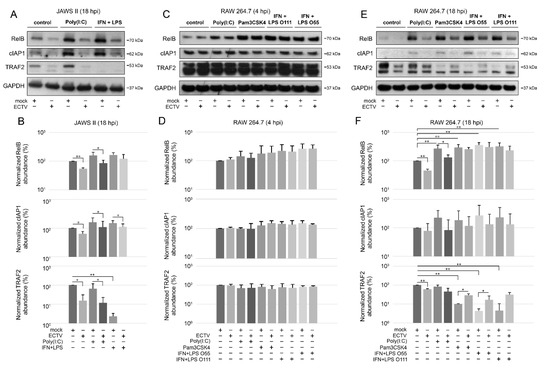 ECTV influences the expression of components of the noncanonical NF-κB signaling pathway in JAWS II and RAW 264.7 cells. (A) Immunoblots of mock- and ECTV-infected JAWS II cells untreated or treated with poly(I:C) or rmIFN-γ + Escherichia coli LPS O111:B4. (B) Densitometric evaluation of RelB, cIAP1, and TRAF2 expression in JAWS II cells. The analysis was based on the data of two independent biological experiments. The data are shown on histograms with a logarithmic scale. * p ≤ 0.05, ** p ≤ 0.01. GAPDH—loading control. (C) Immunoblots of mock- and ECTV-infected RAW 264.7 cells at 4 hpi. Cells were left untreated or were treated with poly(I:C), Pam3CSK4, rmIFN-γ + E. coli LPS O55:B5, or rmIFN-γ + LPS O111:B4. (D) Densitometric evaluation of RelB, cIAP1, and TRAF2 expression in RAW 264.7 cells. The analysis was based on the data of two independent biological experiments and is plotted on histograms with a logarithmic scale. GAPDH—loading control. (E) Immunoblots of mock- and ECTV-infected RAW 264.7 cells at 18 hpi. Cells were left untreated or were treated with poly(I:C), Pam3CSK4, rmIFN-γ + E. coli LPS O55:B5, or rmIFN-γ + LPS O111:B4. (F) Densitometric evaluation of RelB, cIAP1, and TRAF2 expression in RAW 264.7 cells. The analysis was based on the data of two independent biological experiments and is plotted on histograms with a logarithmic scale. * p ≤ 0.05, ** p ≤ 0.01. GAPDH—loading control.